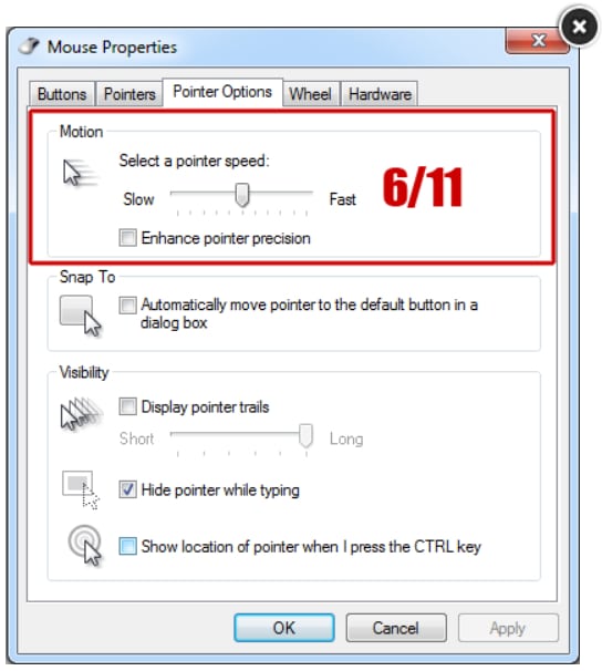 Chọn tab “Pointer Options” (Tùy chọn Trỏ chuột). Đây là tab điều chỉnh tốc độ trỏ chuột, hay nhiều người gọi là “độ nhạy chuột”. Dùng thanh trượt “Motion” để chọn tốc độ trỏ chuột cần dùng. Kéo trỏ chuột sang bên phải để tăng tốc độ/độ nhạy. Kéo sang bên trái để giảm tốc độ và tăng độ chính xác.