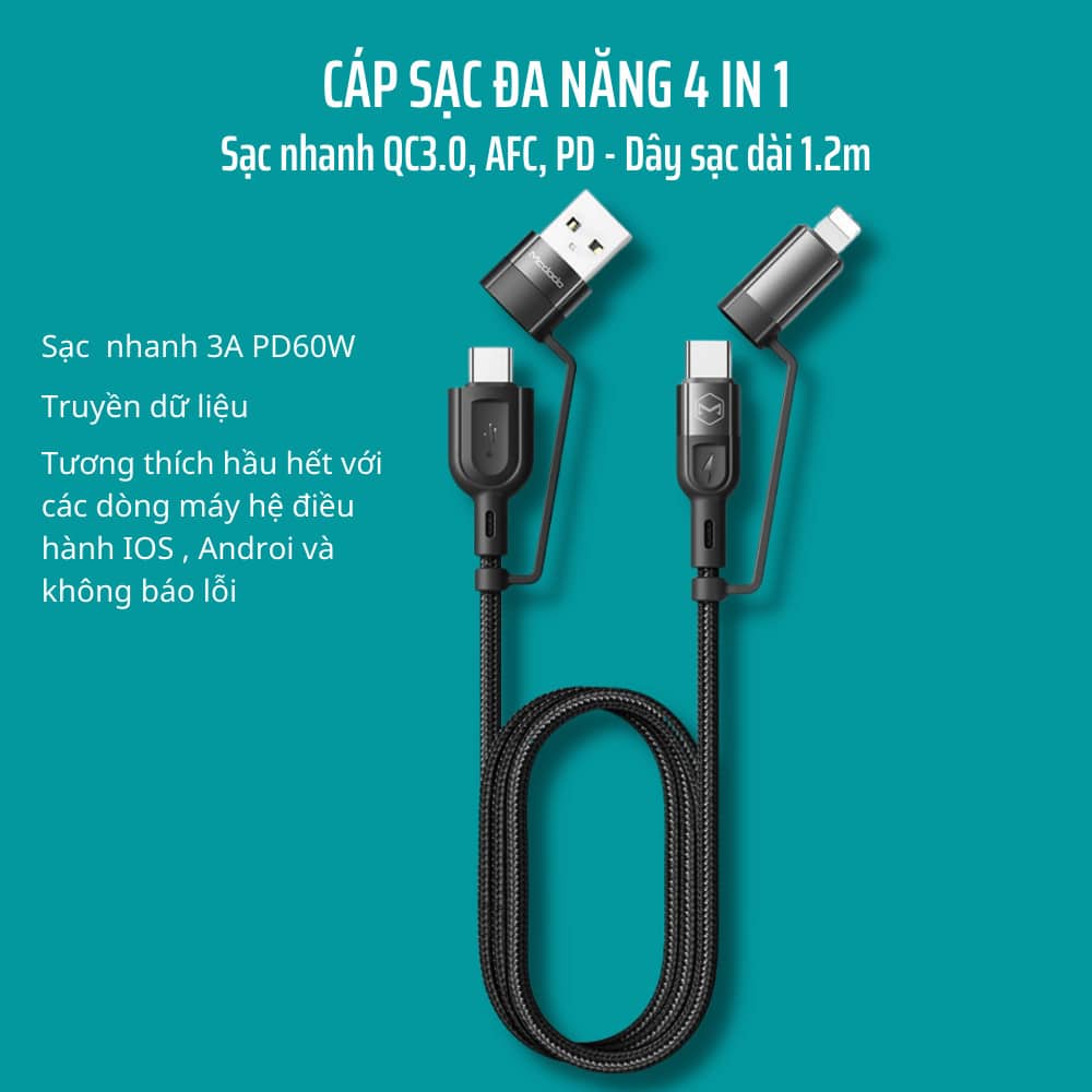 Cáp sạc đa năng là sản phẩm dây sạc được tích hợp nhiều cổng trong 1 dây sạc, cho phép sạc cùng lúc nhiều thiết bị điện thoại sử dụng 3 đầu kết nối khác nhau: lightning, Type C, micro USB với khả năng tương thích cao.