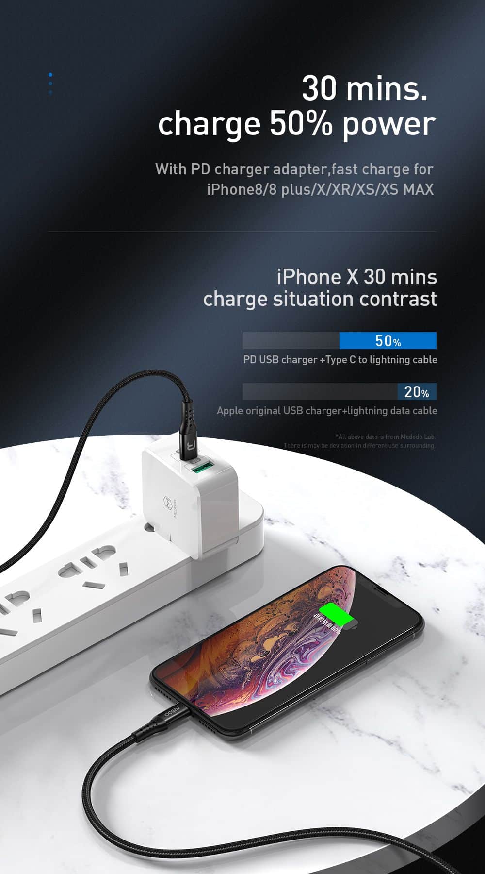 30 phút sạc 50% năng lượng với bộ chuyển đổi bộ sạc PD18W , sạc nhanh cho iPhone8 / 8 plus / X / XR / XS / XS MAX và các thiết bị hỗ trợ sạc nhanh PD khác.