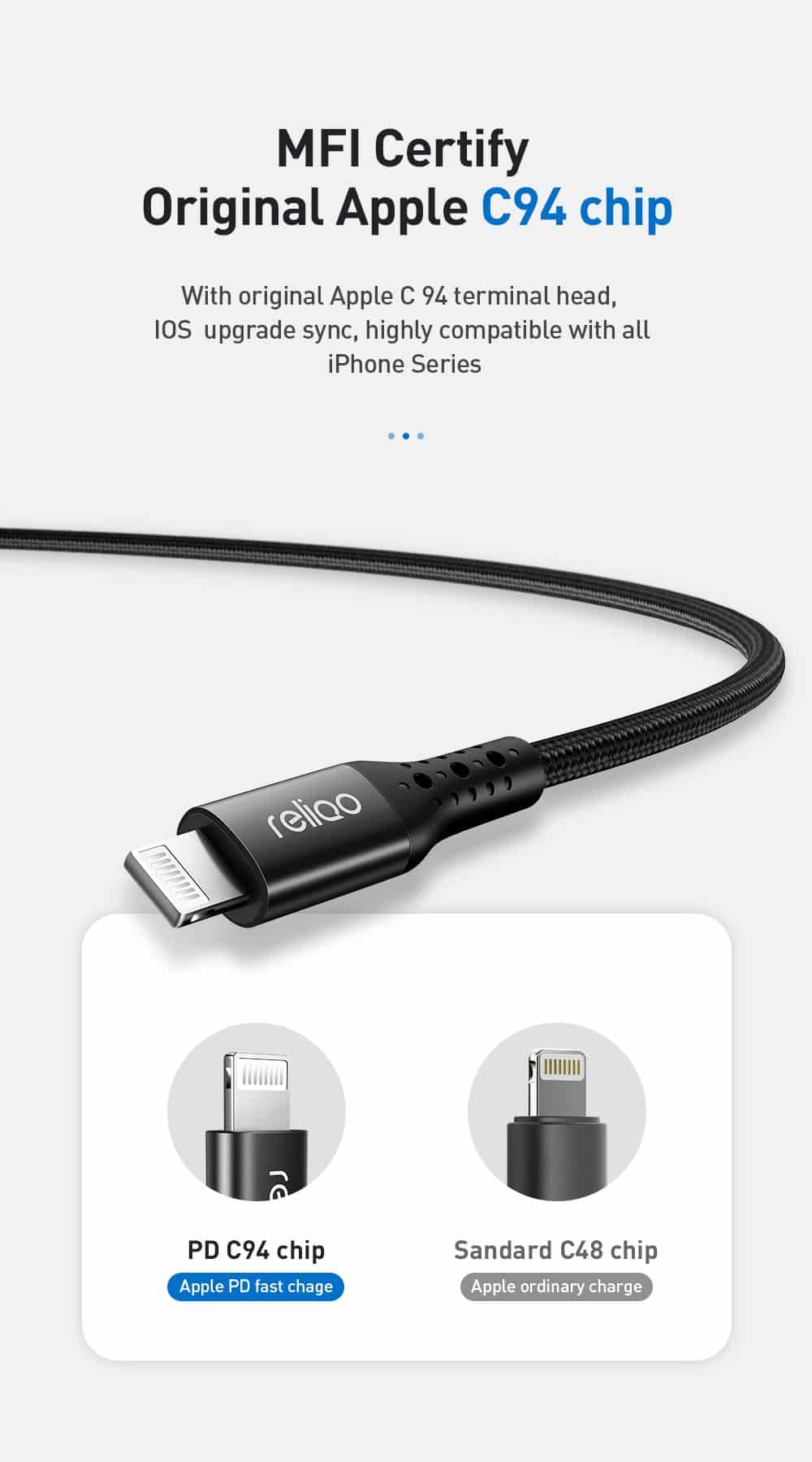Cáp Reliqo RCA-705 sử dụng chip Apple C94 gốc Vớiôi đầu cuối Apple C 94 nguyên bản, đồng bộ nâng cấp 105, tương thích cao với tất cả các Dòng iPhone