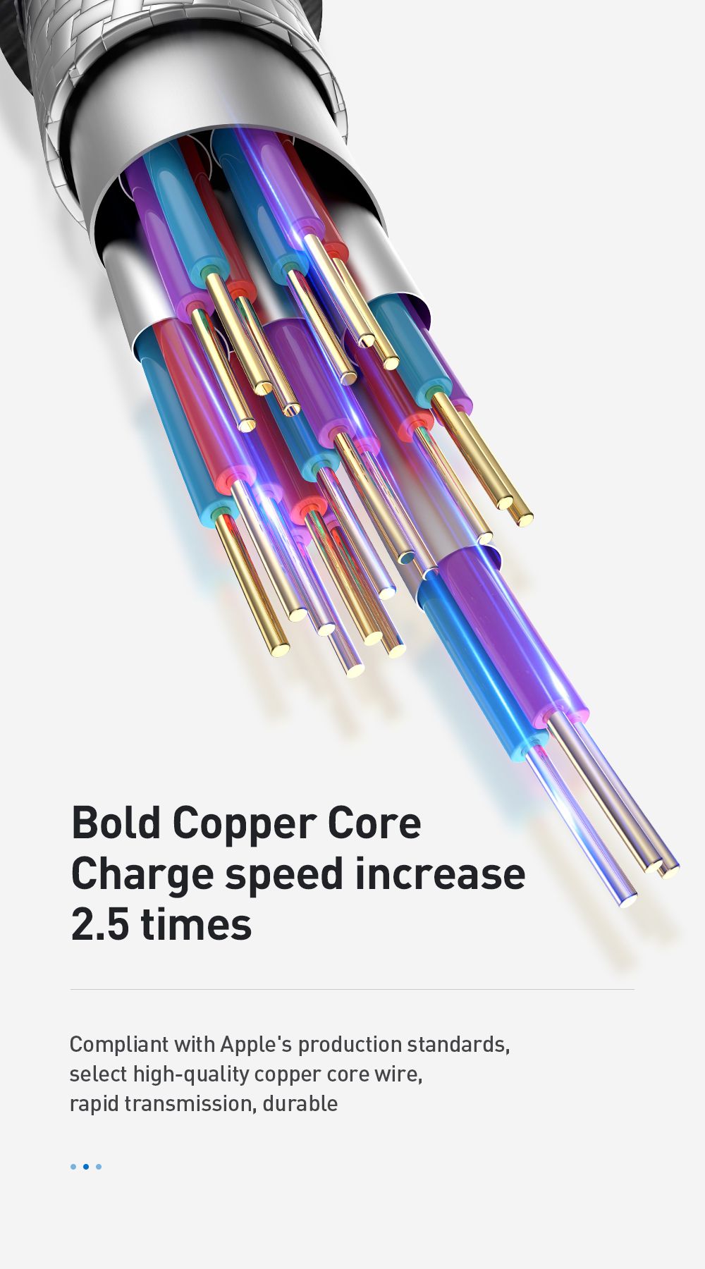 Tốc độ sạc lõi đồng tăng 2,5 lần tuân thủ các tiêu chuẩn sản xuất của Apple, thiết lập dây lõi đồng chất lượng cao truyền tải nhanh chóng, bền.