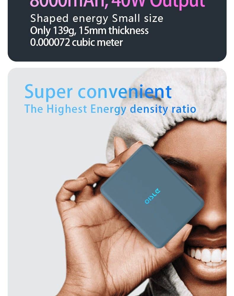 pin mỏng, nhẹ, độ dày chỉ 15mm, kích thước 61x79x15mm và trọng lượng 150g có thể bỏ vào ví hoặc túi . Hoàn hảo cho công việc, ngày lễ hoặc ngày đi chơi.