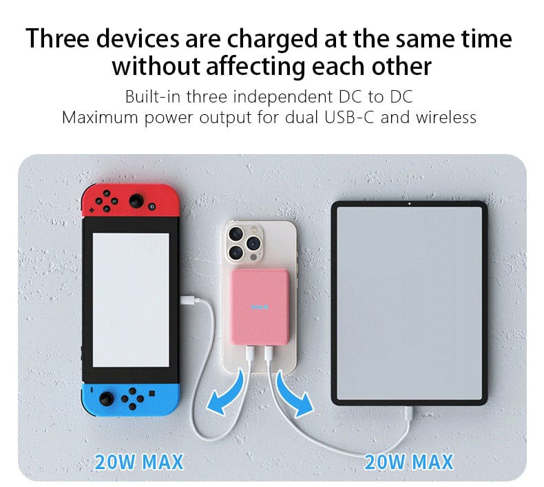 Sạc ba thiết bị cùng lúc mà không ảnh hưởng đến nhau, 1 điện thoại của bạn sạc không dây trong khi sạc cùng lúc cho 2 thiết bị khác qua cổng USB-C kép. (Tổng công suất tối đa 40W)